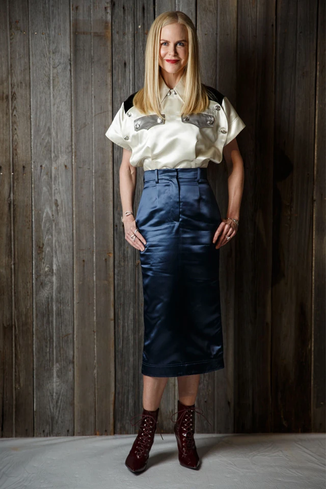 Nicole (természetesen) Calvin Klein kollekciójából válogatott, és egy fehér selyemfelsőt, és hozzáillő kék selyemszoknyát választott. Az egyenruhára hajazó szett színvilága remekül kiemelte Nicole tónusait, és a fazonban sem tudunk belekötni, de valami mégis zavaró ebben a ruhában. Talán túl hivatalos, túl szigorú? Ti mit gondoltok?