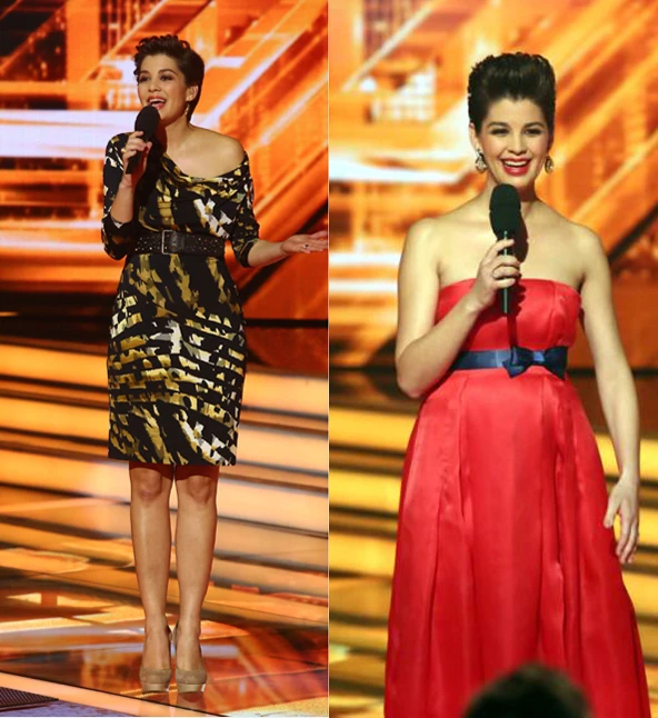 A finálén aztán némileg javítottak az összképen: Nóra egy klasszikus szabású piros estélyit viselt kék masnival a pocakja felett. Nektek melyik verzió a nyerő?