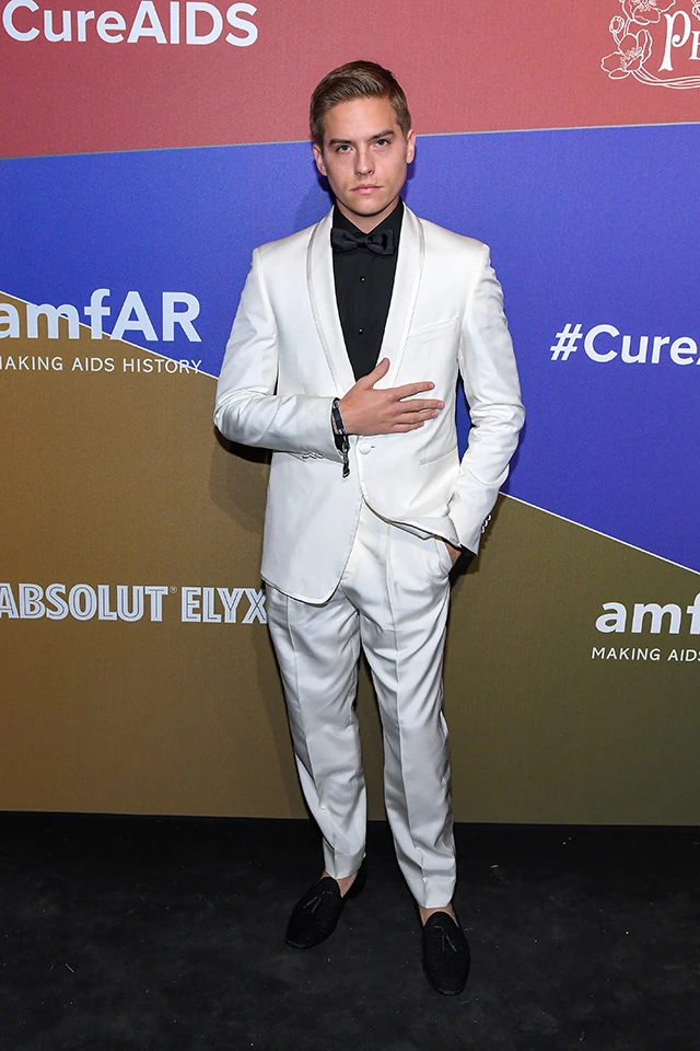 Aztán az amfAR gálán is felbukkant, itt már jóval elegánsabbra vette a formát tekintve az esemény black tie dresszkódjára. Sprouse azonban csavart egyet a dolgon és nem fekete öltönyben, hanem hófehér szmokinban lépett a vörös szőnyegre, amit fekete inggel, csokornyakkendővel és cipővel viselt.