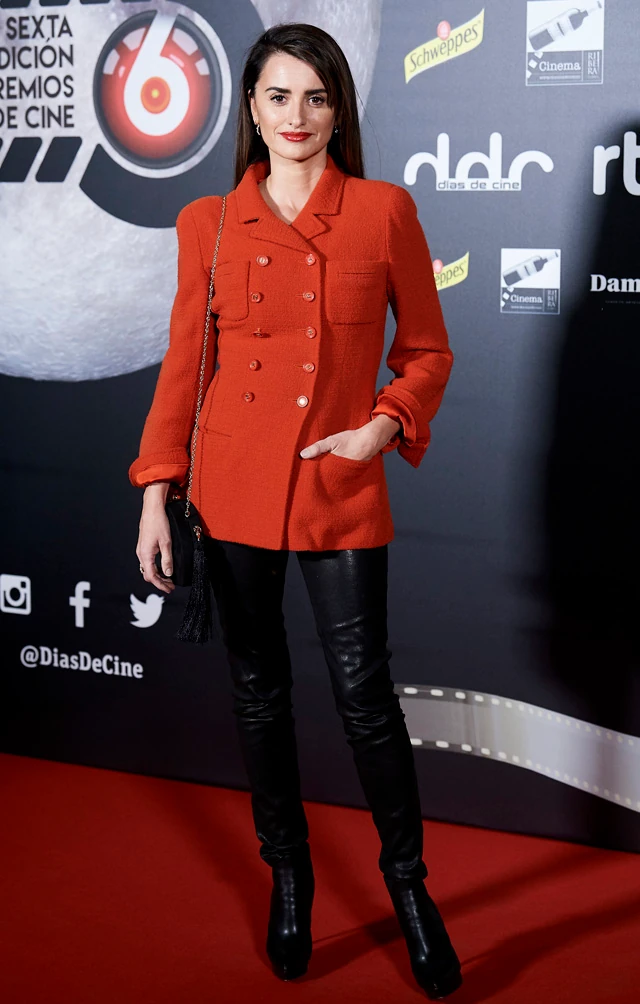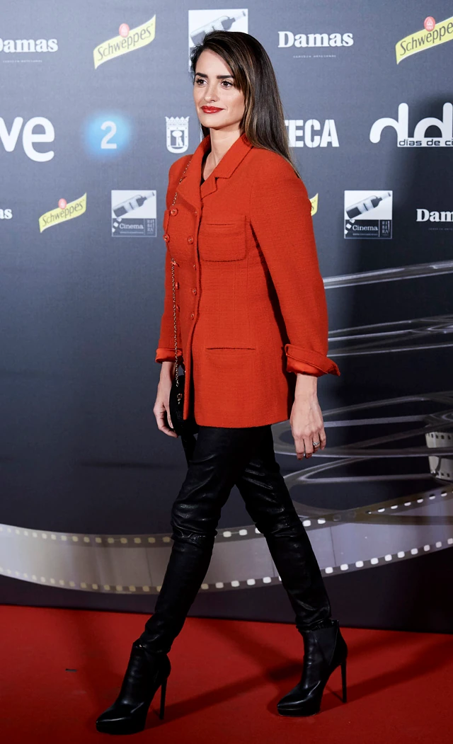 Penélope pirosban lépett a vörös szőnyegre, amit ugyanilyen színű rúzzsal kombinált. A színésznő Chanel kiskabátjához tökéletesen illett a bőrnadrág, illetve a fekete magas sarkú bőrcsizma.