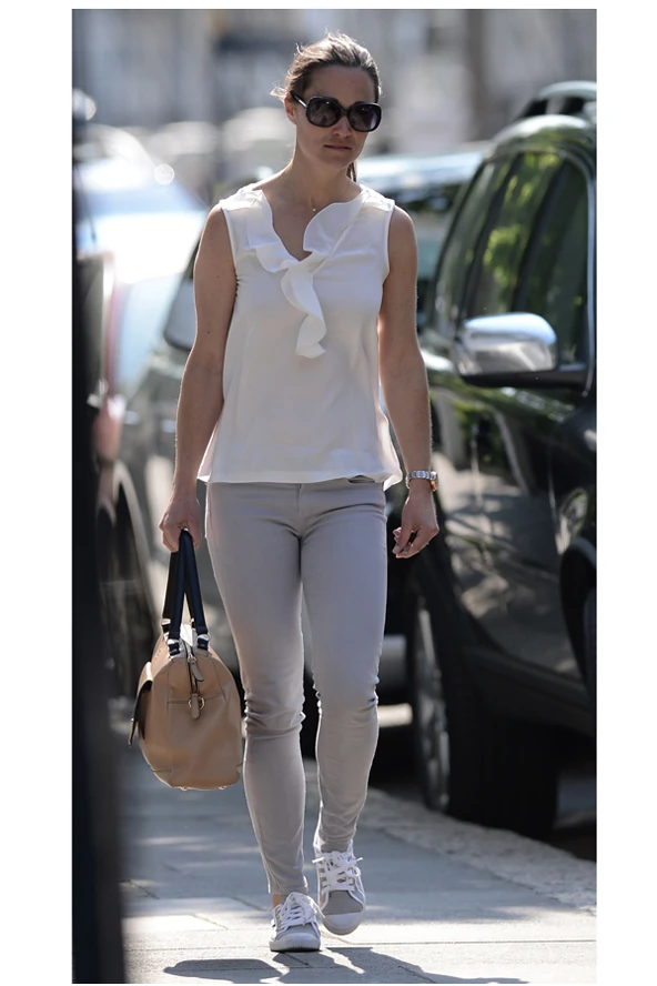 Pippa Middleton legalábbis tegnap már ujjatlan, fehér blúzt, bézs nadrágot és egy szürke tornacipőt húzott. Természetesen a hercegné húga a színvilághoz passzoló táskával egészítette ki a szettjét. Mi talán azt kedveljük Pippa Middelton utcai stílusában, hogy minden hivalkodástól mentes. A Middleton-lányok vonzereje talán éppen abban áll, hogy az ismertség, illetve a szerzett királyi rokonság nem változtatott rajtuk, szerinted is ez lehet népszerűségük titka?