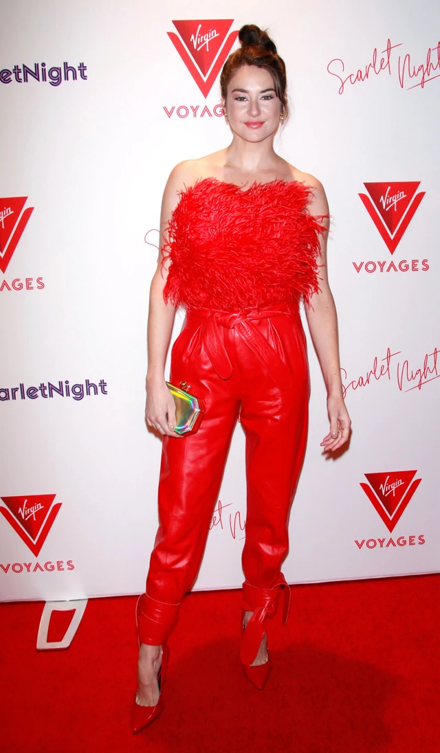 Shailene elképesztően dögös volt a Valentin-napi szettben: egy tollas Attico felsőt és piros bőrnadrágot hordott. Kiegészítőként egy gyönyörű piros magas sarkút és kistáskát viselt.