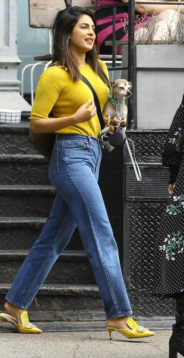 A színésznő most megmutatta nekünk, hogy hogyan is érdemes hordani az ősz színét, a sárgát. Priyanka egy teljesen egyszerű szettben érkezett lakására New Yorkban, és kiskedvencét is vitte magával.