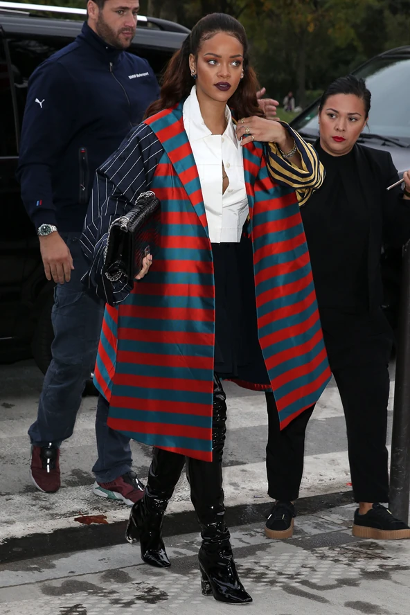Rihanna egyik estéjét az Eiffel-torony éttermében töltötte, ahova édesanyjával és testvérével ment el vacsorázni. Az asszisztense az énekesnő minden lépéséről ismét tudósított Snapchaten, úgyhogy mi is kicsit úgy érezhettük magunkat, mintha a popsztárral vacsoráznánk együtt. Erre az alkalomra Rihanna egy fekete lakkcsizmát, fekete szoknyát és ropogós fehér inget viselt. A csíkos kabátot pedig lehet van, aki inkább a cirkuszi porondra képzelné el, de szerintünk istenien néz ki! Neked hogy tetszik Rihanna szettje?