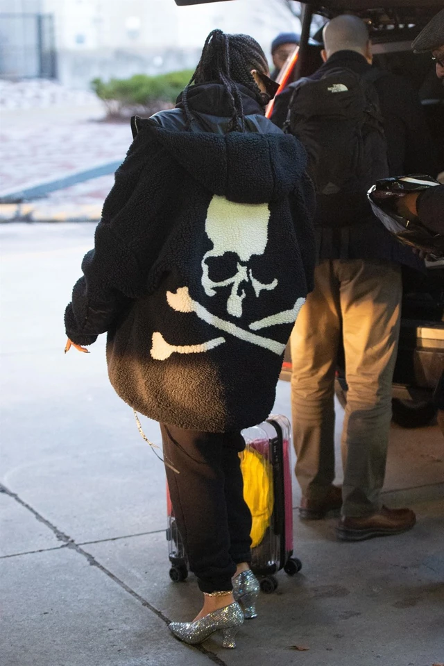 A napokban is ezt mutatta be New Yorkban, ahol a reptéren kapták lencsevégre eklektikus szettjében. Rihanna fekete melegítőjét az egyik kedvenc téli dzsekijével viselte, a teljesen fekete outfitet pedig ezüstös flitterekkel borított magas sarkúval párosította.