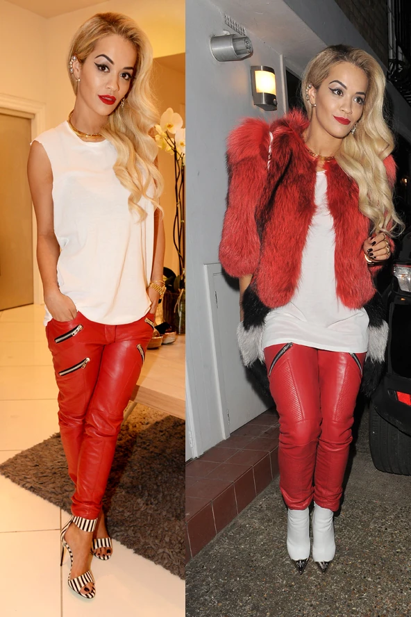 Most éppen egy új cipőkollekció debütálásán vett részt a londoni Topshop boltban, és erre az alkalomra egy tűzforró nadrágot választott. No, nem olyan értelemben, hogy alig takart hátsójából valamit, hanem ez a vérnarancsszínű, ultra vagány bőrnadrág egyszerűen szuper, és mi is azonnal tudni akarjuk, honnan vette! Szettjét az este folyamán aztán még tudta fokozni, amikor cipőt cserélt, és felkapta a hátára ezt a vörös, szőrös kabátot. Nos, neked hogy tetszik Rita Ora megjelenése?
