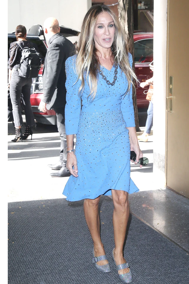 Egy ilyet mutatott be éppen Sarah Jessica Parker, aki egy eseményre igyekezett ebben a világoskék, szegecses ruhában. A stílusikon a ruhát egyik saját tervezésű, ezüstös flitteres cipőjével egészítette ki, valamint egy nagy ezüst nyaklánccal és fekete táskával.