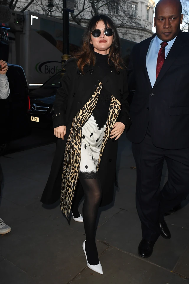 Selena Gomez a tegnapi napot is interjúkkal töltötte, több rádióműsorban is megfordult. Az egyik kedvenc szettünk ez a fekete-fehér csipkeszegélyes ruha volt, amit fekete harisnyával és fehér magas sarkúval viselt. Az angol időre való tekintettel egy fekete trencskót viselt a ruhán, aminek a bélése nagyon ütős leopárdmintás volt.