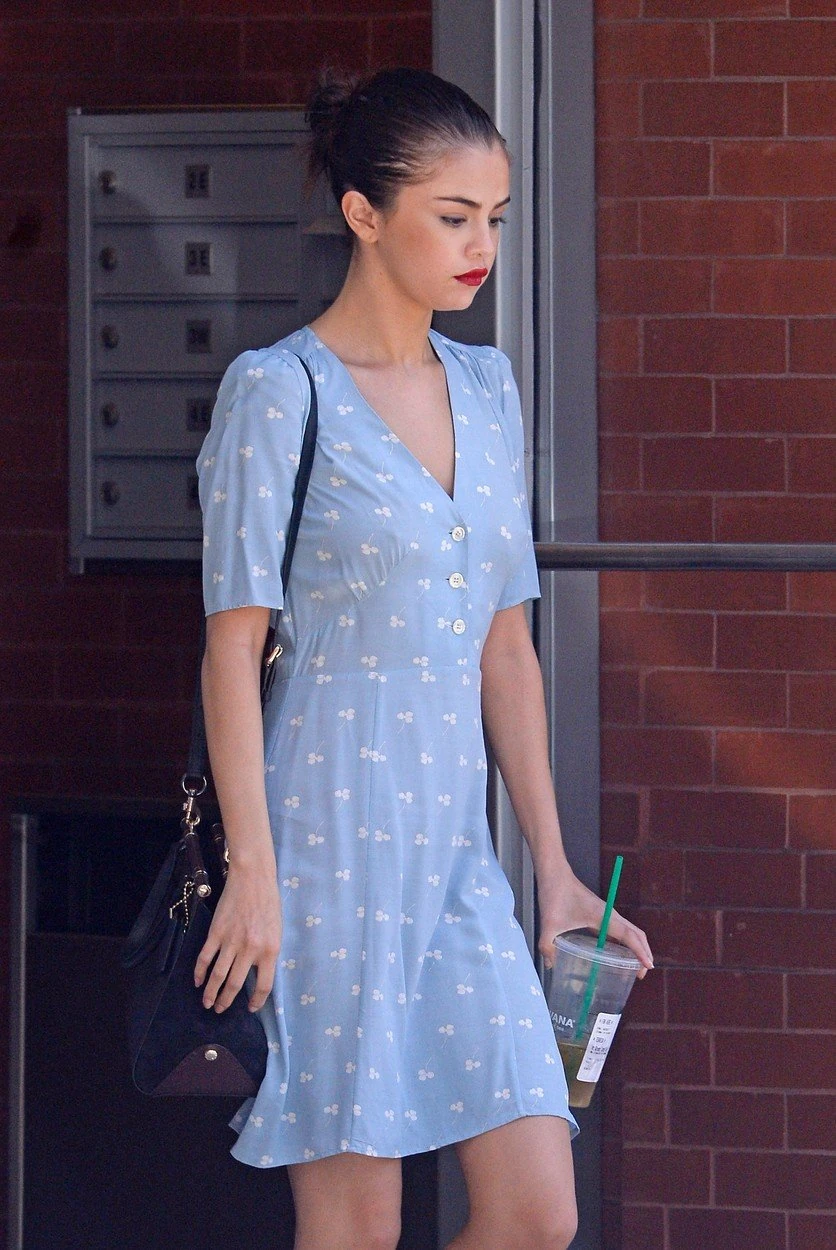 A nap első felében Selena New Yorkba érkezett új filmjének forgatására, amikor egy nyarat (és az ágyunkat) idéző kék alapon fehér mintás ruhát viselt.
