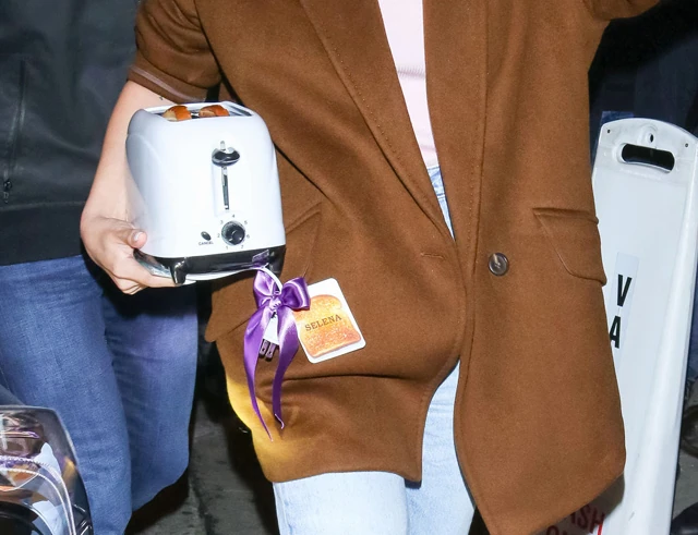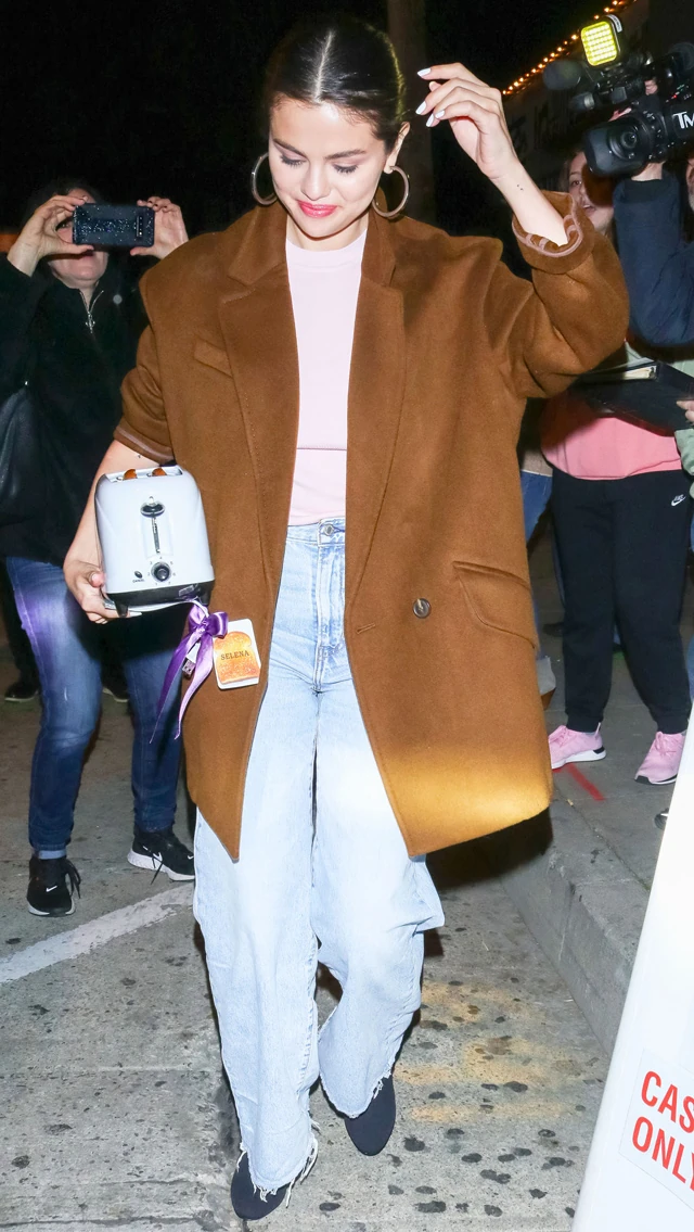 Ezt követően Selena Gomez felbukkant az utcán, hogy a pazar vörös szőnyeges formája után megmutassa a bámulatosan laza utcai stílusát is. Egy olyan oversize zakós szettet villantott, hogy még az oversize zakós összeállítások közül is kitűnik ez a minden szempontból túlméretezett darab. Nagyon laza, és az is biztos, hogy soha nem láttunk még olyan vagány kiegészítőt, mint amit Selena Gomez cipel a kezében, hiszen egy kenyérpirítót visz magával táska helyett, és eléggé igazinak is tűnik.