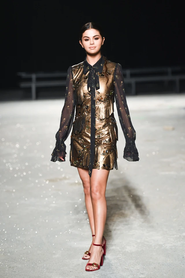 A divatbemutatóra egy izgalmas, apró virágmintákkal és applikációkkal díszített fekete tüllujjas ruhában érkezett, a hosszított ujj nem véletlen, idén ősszel a trend a lelógó, fodros ujjak, úgyhogy feltétlenül neked is be kell szerezni egy hasonló topot a szezonra, hogy kellőképpen trendi legyél. A ruha aranyszínű, rojtos, strasszkövekkel kirakott elsőrésze pedig igazi eleganciát vitt Selena megjelenésébe.
