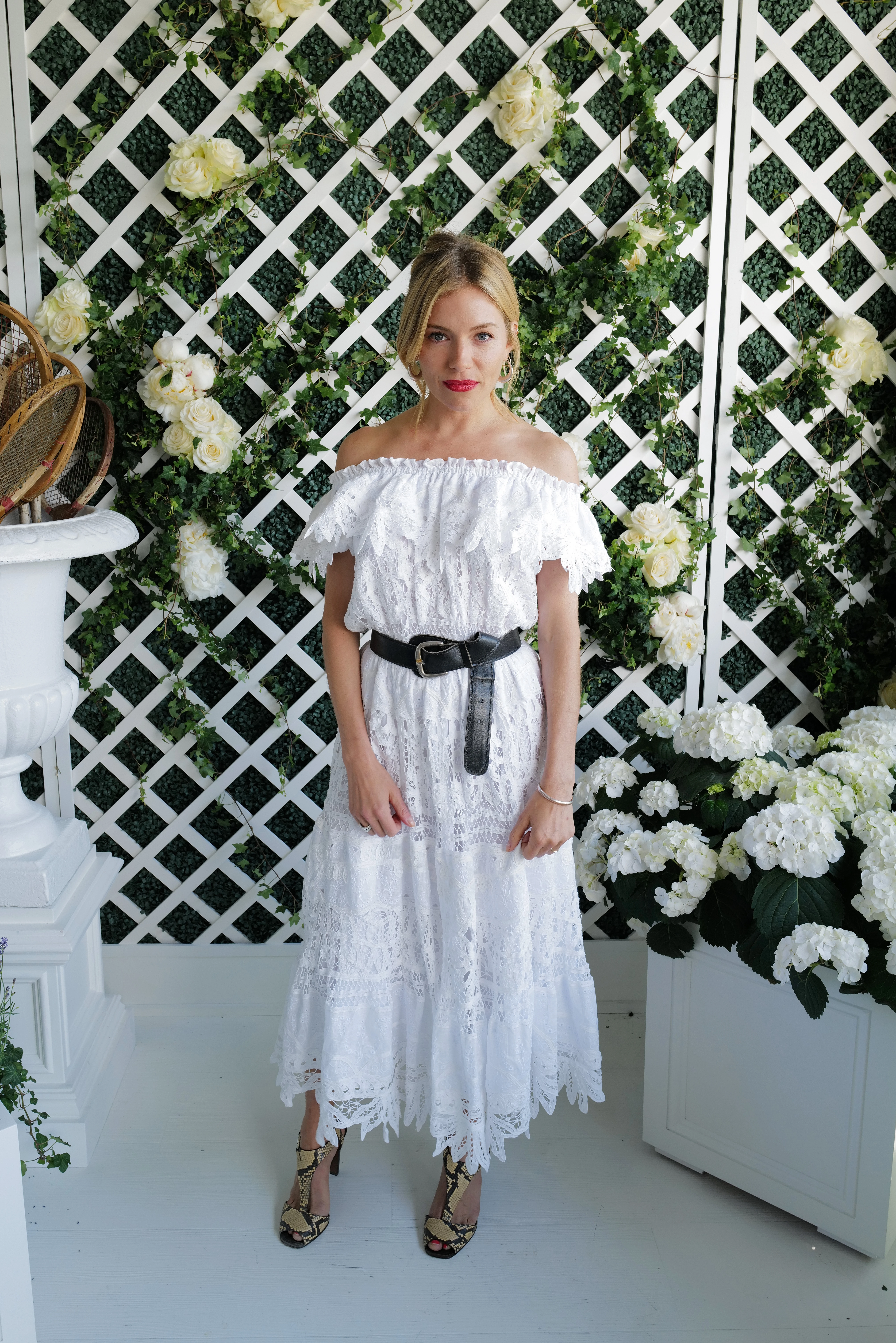 Wimbledonba már egy elegánsabb és amolyan igazán Sienna Milleresen bohém szettben érkezett, ahol egy ebéden is részt vett a divatvilág krémjével. Az eseményre a 40 éves színésznő fehér, derekán övvel megkötött Ralph Lauren ruhában és vagány, állatmintás szandálban érkezett.