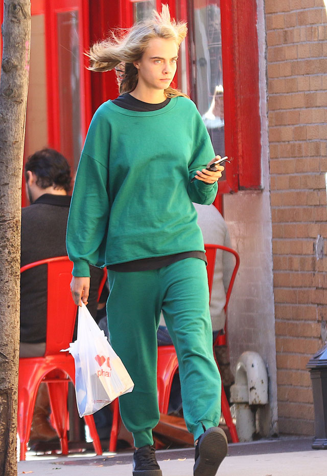 Nem biztos, hogy a hírnévben ez a legjobb, mondjuk vannak, akik magasról tesznek rá, ha felbukkannak a fotósok, ők megpróbálnak normális életet élni. A topmodellből színésznővé avanzsáló Cara Delevingne pontosan ilyen híresség. Nem igazán izgatja magát, ha nincs mindig csúcsformában. Sőt, mintha külön törekedne rá, hogy amikor épp nincs hivatalosan dolga a lehető legslamposabb legyen. Ki tudja, talán így akar rejtőzködni. Ez mindenesetre nem nagyon sikerül neki. Így aztán megállapíthatjuk, hogy kinyúlt melegítőben, smink nélkül, nejlonzacskóval a kezében, róla sem mondaná meg senki, hogy a bájos pofijával, és a formás alakjával keresett máris milliókat. De hát, ez valószínűleg mindenkire igaz lenne, nemde?