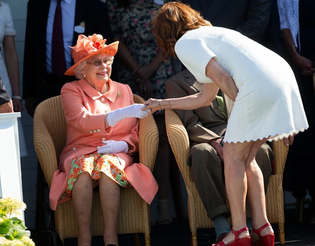 A 71 éves színésznő azonban úgy tűnik, nem ismeri elég jól a protokollt és hatalmas hibát vétett, nem beszélve arról, hogy egy igencsak sokat mutató ruhában közelítette meg a királynőt és Fülöp herceget.