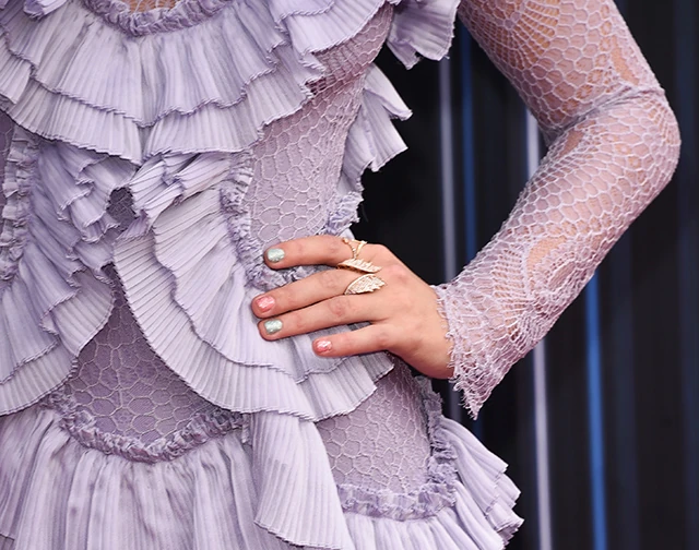 Taylor Swift egy rendkívül bonyolult, fodros, csipkés, levendulaszínű Raisa & Vanessa miniruhában érkezett a vörös szőnyegre. Nem is vártunk volna mást tőle, minthogy egy hasonló, nagyon romantikus, pasztellszínű darabban jelenjen meg, hiszen most teljesen ebben a világban él.