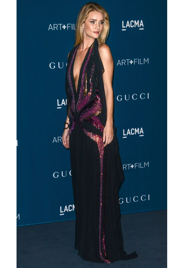 Rosie Huntington-Whiteley, aki az utóbbi időben decens szettekre szavazott, erre az estére felidézte nem is olyan régi vérforraló szettjeit. Az angol topmodell igazi dekoltázsbajnok volt, és most is tud ő, ha akar. Volt tehát mivel elterelni a figyelmet arról, hogy lila-arany flittrekkel díszített Gucci darab valahogy sehogy sem állt neki. Igaz, ha Rosie Huntington-Whiteley alakján nem érvényesült ez a kreáció, akkor vajon kin?