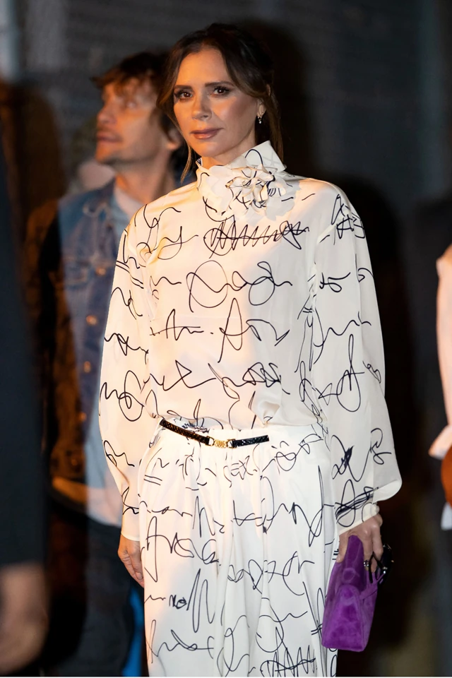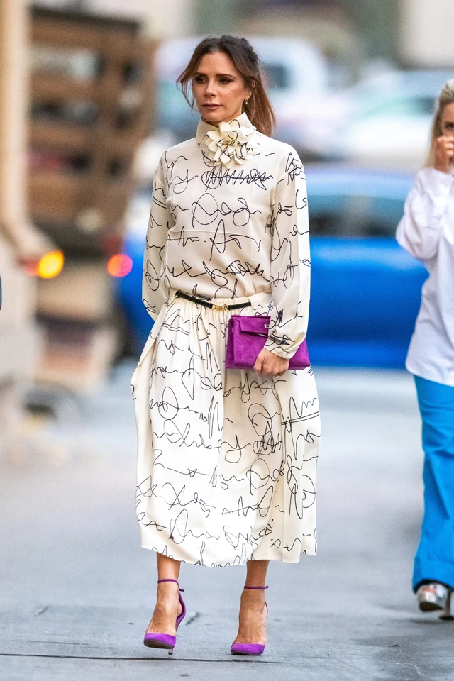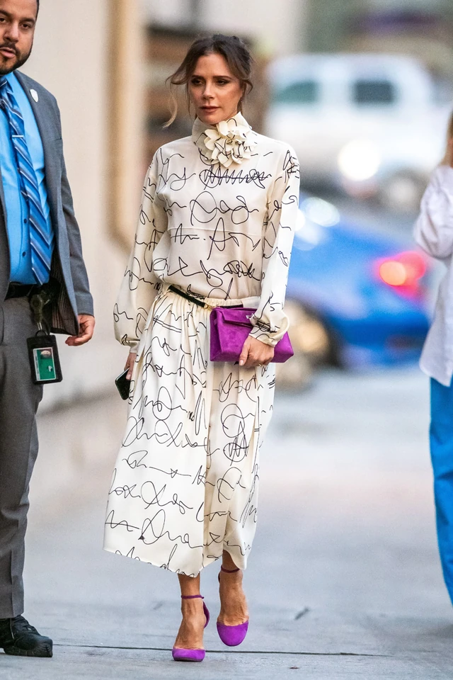 Most Jimmy Kimmel műsorának volt a vendége, és a forgatásra sikkes fehér alapon kézírásos együttesben érkezett. A nyakán az ugyanolyan anyagból készült virágdíszítéses szetthez Victoria Beckham világoslila kiegészítőket párosított, a hasított bőr clutch és pántos cipő kombináció remekül feldobta a szettet és izgalmas színtörésnek bizonyult, de gyakorlatilag bármilyen élénkszínű kiegészítővel tökéletes működik ez az összeállítás.
