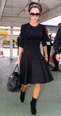 Victoria az utóbbi időben meglehetősen érdekes repülőtéri szetteket állított össze, most sokkal visszafogottabb volt. A londoni Heathrow repülőtéren Beckhamné kivételesen nem viselt tányérsapkát és a Balmain bőrkabát is elmaradt. A rendkívül elegáns Victoria egy átlátszó fekete felsőt viselt, fekete sapkával, amelyhez egy Louboutin bokacsizmát húzott és egy fekete Azzedine Alaia kardigánnal egészítette ki a szettet. Hogy ne keltsen túlzottan gyászos benyomást egy fekete-fehér hajpánttal vidámította az összeállítást. Kicsit emlékeztet ez a szett a