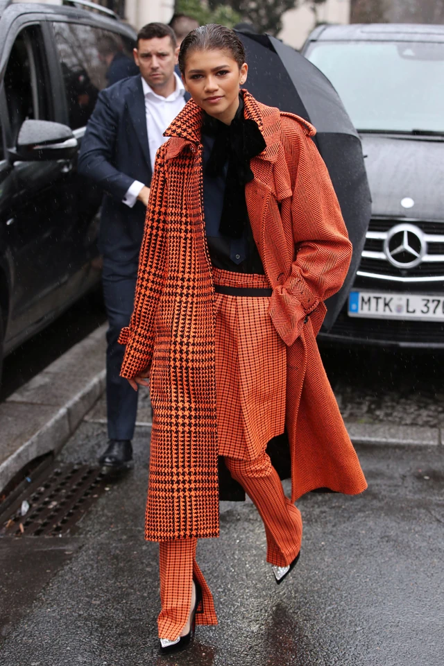 Most Párizsban mutatta meg, hogy mennyire menő a Sacai új őszi kollekciójának egy lookjában. A narancsszínű kockás nadrág és a hozzá passzoló, szintén kockás, tyúklábmintás gyapjú trencskója alatt egy sötétkék, masnis blúzt viselt, azonban a szettjében a nadrágon látható második, rövidnadrágos réteg az igazán izgalmas. Nem is nagyon értjük, hogy mi lehet a funkciója azonkívül, hogy kreatív, viszont Zendayán még ez is jól mutat. Persze nem véletlenül viseli a sztár sem ezt a trendet, ami a Max Mara kifutóján is látható volt a divathéten.